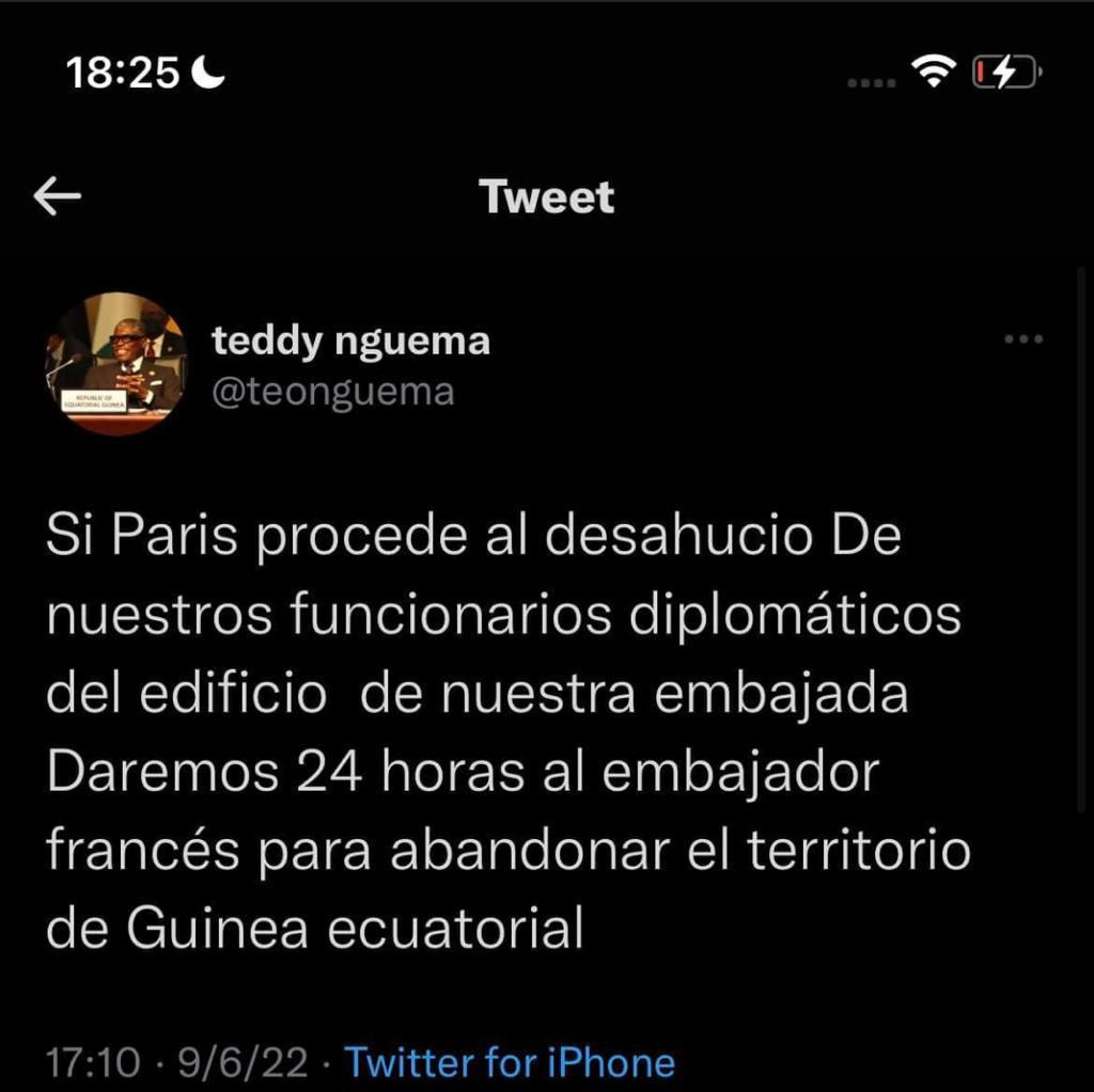 Les jeunes équato-guinéens ont ouvert le bal. Ces derniers, en effet s’activent sur les réseaux sociaux, notamment sur Twitter, et multiplient les appels à la réciprocité au cas où, la représentation diplomatique de leur pays viendrait à être sommée de quitter l’immeuble qui abrite sa chancellerie et son consulat, le 42 avenue Foch à Paris dans le 16 ème arrondissement. Ils sont très nombreux, ces jeunes qui ne cachent pas leur amertume, et qui disent très clairement leur avis. Ces jeunes se disent prêts à demander, l’application des mesures proportionnelles, c’est-à-dire, le départ de la représentation diplomatique française à Malabo, sous 24 heures. Ils estiment que cela, est indispensable.